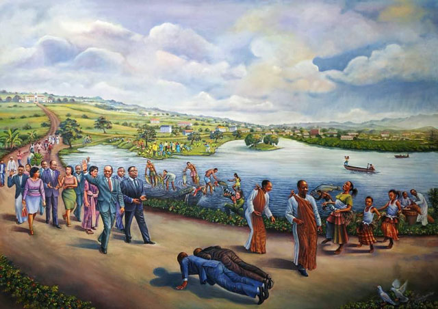 This underscores one of the core principles of Buganda which is togetherness- Obuumu. In the painting, one observes people belonging to different political orientations -represented by a range of political colours of yellow, red, green and orange-sharing the same space and even shaking hands! The composition of his entourage re-emphasizes his liberal character. Right besides him is the Katikiro,Peter Charles Mayiga who according to Buganda culture is the connection between the subjects and the Kabaka. He is an ordinary figure with no royal background. This is symbolic to the ideal of inclusiveness where everyone iswelcome to serve and contribute to the Kingdom. This inclusivity is further highlighted in the varied number of seasoned politicians and government technocrats who are accompanying the Kabaka on this momentous occasion. Here, it is evident that the monarch has no political affiliations and is therefore a symbol of unity. The middle ground of the painting suggests plenty of activity going on in the water and on the shores. A typical scene on the Lake involves fishing in canoes, swimming by the youth and sometimes beach parties. In the painting, the artist depicts a lot of fish being caught as a sign of abundant food for the different groups of people who inhabit the Kingdom. Naturally, a land that has plenty of food attracts many people. Similarly, Buganda’s ability to attract a diversity of people is not only inspired by its ancient cordial relationship with outsiders, but also necessitated by the enormous foodstuffs found across the Kingdom.